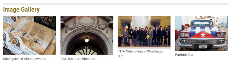 This block type utilizes the new Drupal Media Library system to make it easy to create a mobile-friendly image gallery. As you create one of these blocks, you will be able to upload your images via the Add media button. You should try to give each image a meaningful name – otherwise, the image file name will be shown, which may not be very informative or even understandable. After images have been uploaded, you can drag and drop them to reorder them as you prefer. Once you save your block, thumbnails of each image with the name underneath will be rendered in a gallery format, four images per row. A site visitor can select any image to open the full-size version for better viewing.