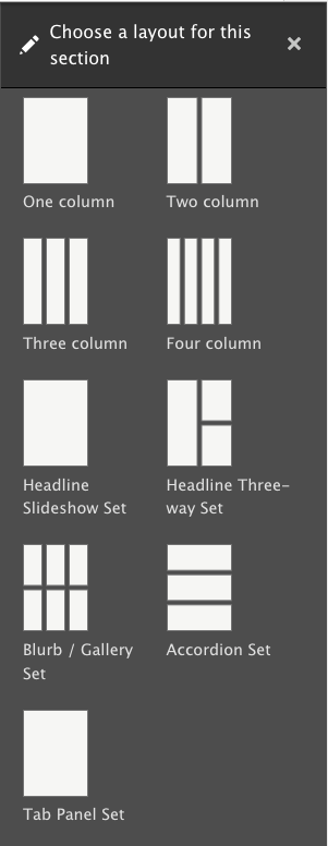 When you select + Add section in the Layout view, a sidebar will open on the right-hand side of the page allowing you to select the layout type you want to add. At the time of this writing, these options are: